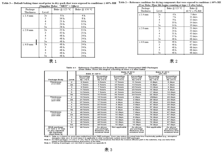 而在2007年版本的IPC/JEDEC J-STD-033(表3)中,对于MSD受潮后的烘烤除湿,更进一步详细提出除125℃烘烤以处的中低温烘烤除湿条件—90℃+≤5%RH与40℃+≤5%RH.而且也摒弃了之前版本中对于150℃条件的烘烤(表2).由此可看出,随着对MSD烘烤的进一步了解,大家也慢慢了解了温度对于烘烤除湿的重要性。特别是对于中低温烘烤,IPC/JEDEC标准详细规定了每个湿敏等级及厚度等级之下,对应的除湿烘烤时间。