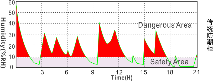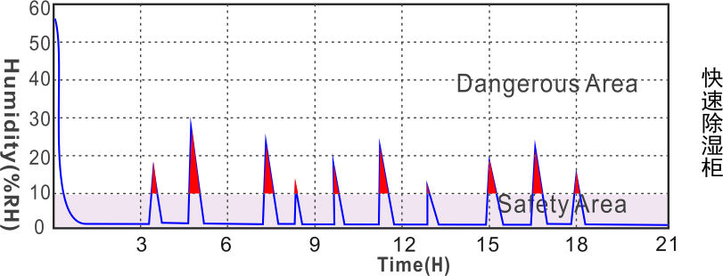 左图可见,当相对湿度小于30%RH时,金属的氧化几乎停止了,事实上,由于金属的性质不同,发生氧化的临界湿度值不同。某些活跃的金属,如锂,要在1%RH的环境湿度条件下才不会氧化。科学研究证明, 金属氧化腐蚀的空气相对湿度临界值, 钢为70%RH, 铜为60%RH, 铝为76%RH, 铁为63%RH, 锌为60%RH…,当存储环境湿度≤5%RH时,对于绝大部分金属或者半导体材料而言,腐蚀反应将不再存在。